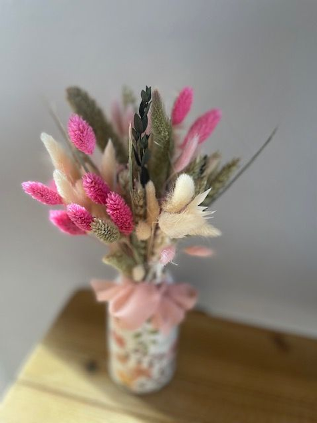 Apportez une touche de douceur à votre intérieur avec ce charmant arrangement de fleurs séchées artisanales, soigneusement composé dans un vase décoré de motifs floraux.