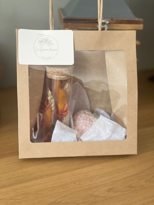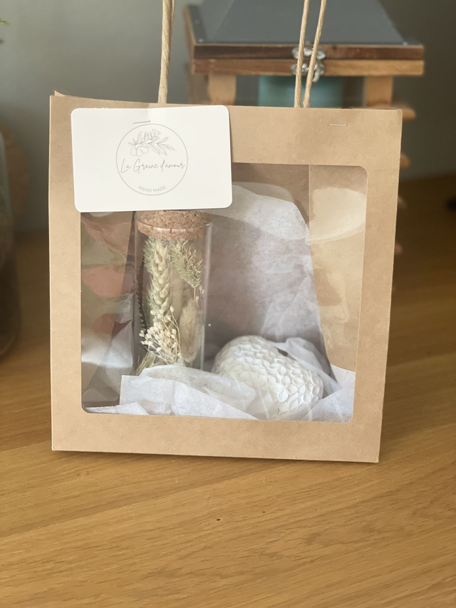 - Présenté dans une élégante boîte kraft avec fenêtre transparente et carte signée "La Graine d’Amour"