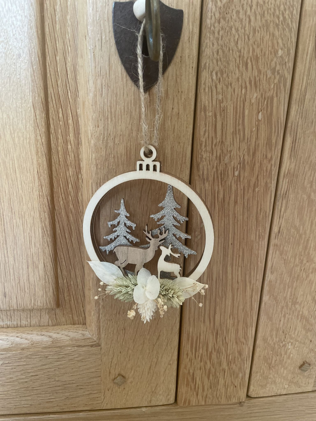 Apportez une touche chaleureuse et naturelle à votre décoration d’hiver avec cette délicate suspension artisanale en bois, représentant un élégant cerf entouré de sapins enneigés. Découpée avec précision, cette décoration évoque l’ambiance douce et féérique des forêts nordiques.