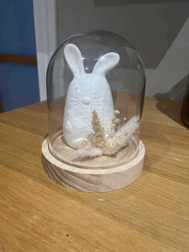À l’intérieur se trouve un petit lapin blanc minimaliste, délicatement mis en scène avec des fleurs séchées et des plumes naturelles, le tout reposant sur un socle en bois clair. Cette composition crée une atmosphère douce et apaisante, parfaite pour une décoration naturelle et élégante.