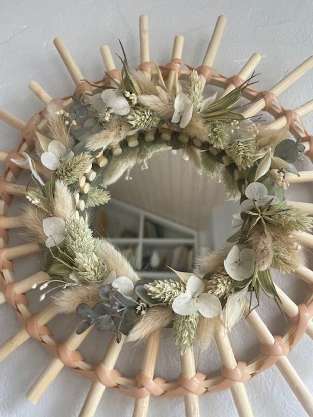 Apportez une touche de douceur et de poésie à votre intérieur avec ce miroir soleil entièrement fait main. Composé de tiges en bois naturel tressées façon rotin et orné de délicates fleurs séchées (eucalyptus, lagurus, hortensias...), ce miroir mural incarne l’élégance du style bohème et champêtre.