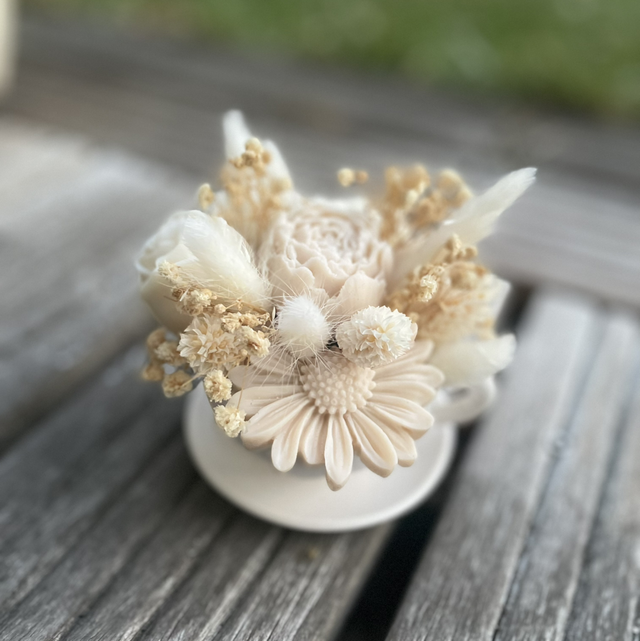 Apportez une touche poétique et vintage à votre intérieur avec cette adorable mini composition florale présentée dans une tasse blanche. Réalisée à la main, elle mêle fleurs séchées naturelles et fleurs en fondant, pour une déco délicate, durable et sans entretien.
