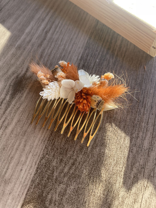 Peigne à cheveux floral au style bohème et romantique, parfait pour une mariée, une demoiselle d’honneur ou pour apporter une touche élégante à une coiffure de cérémonie. Ce peigne doré est délicatement orné de fleurs aux teintes ivoire, de plumes légères et d’éléments naturels qui offrent un rendu doux, lumineux et raffiné.